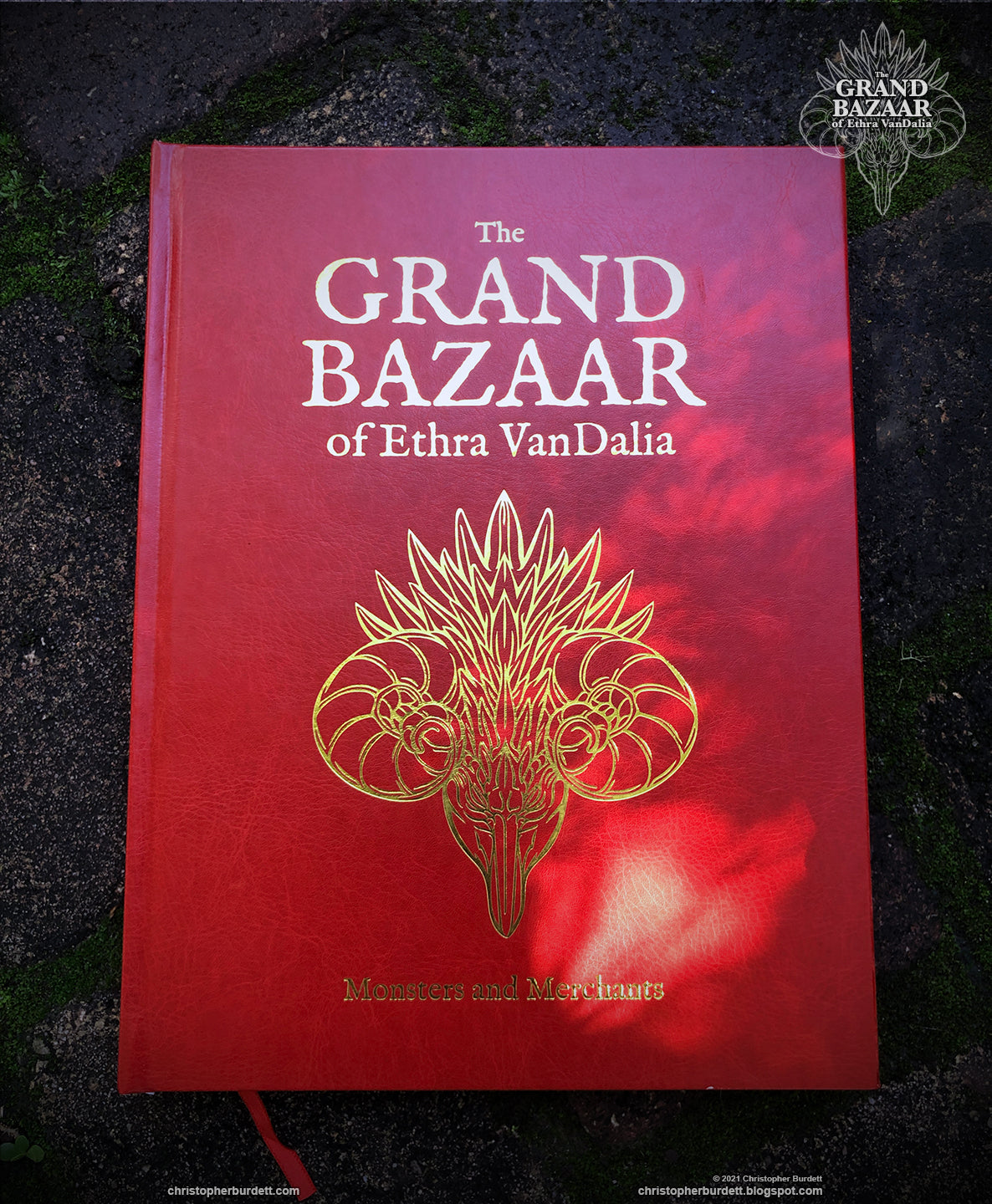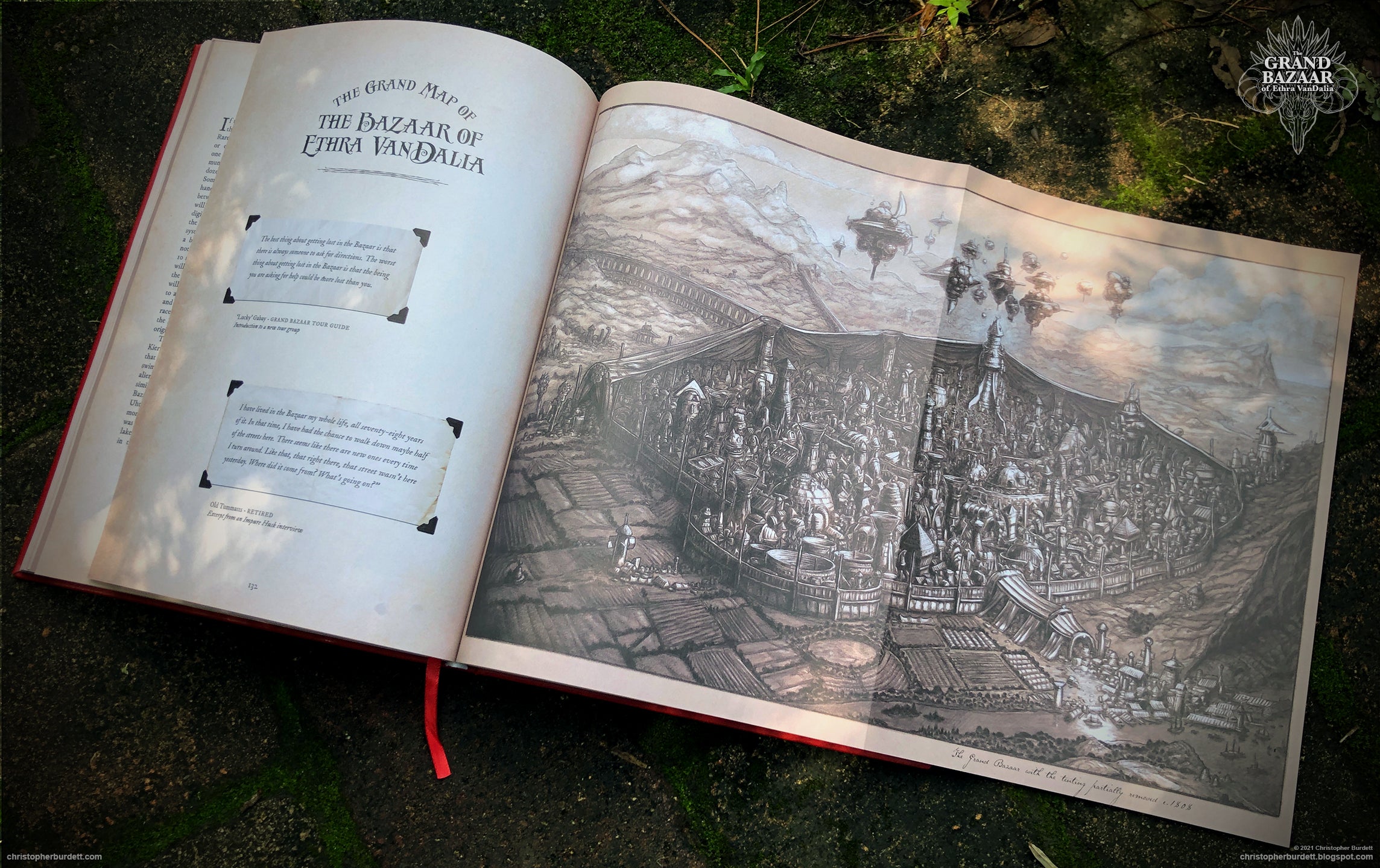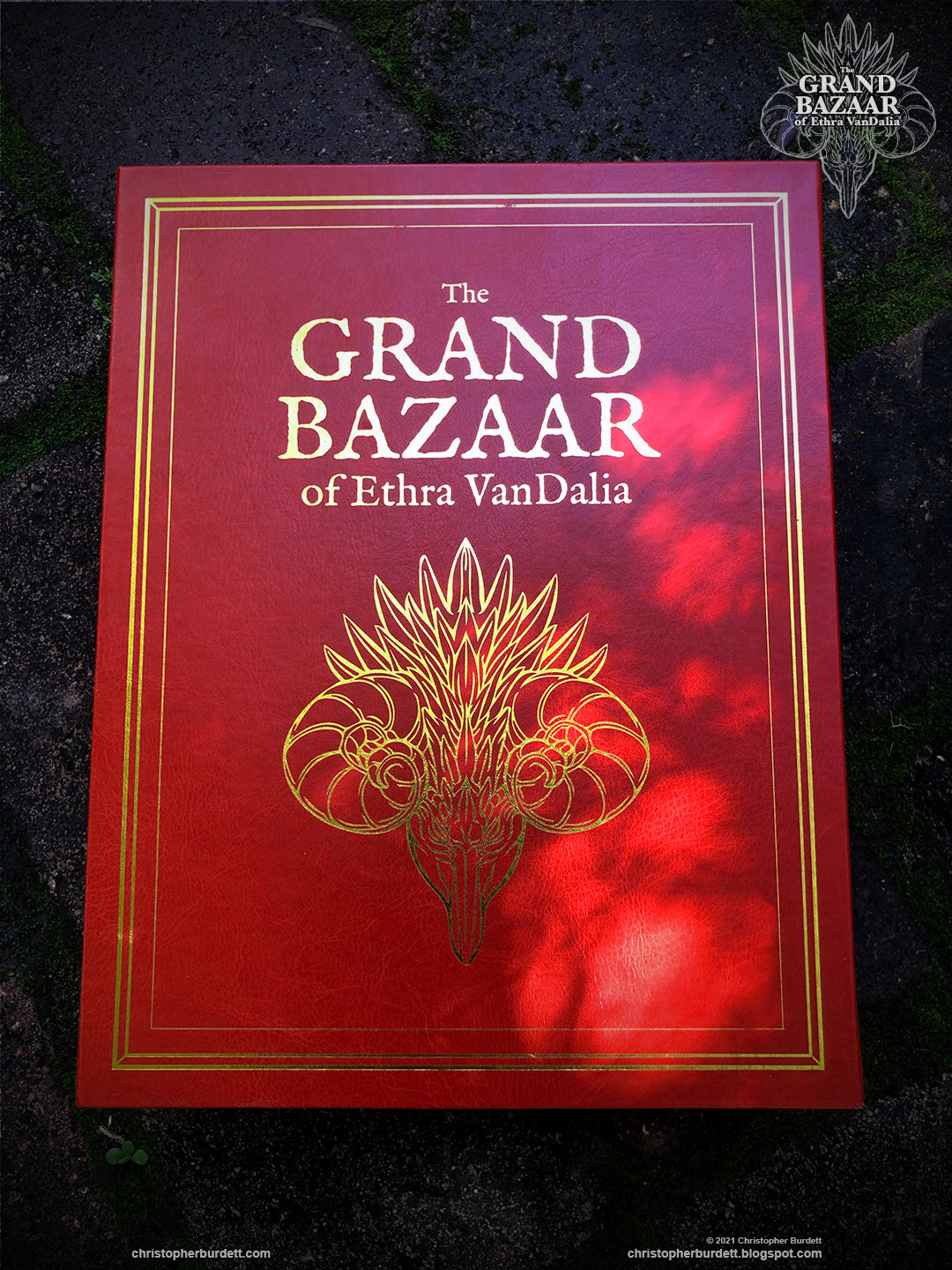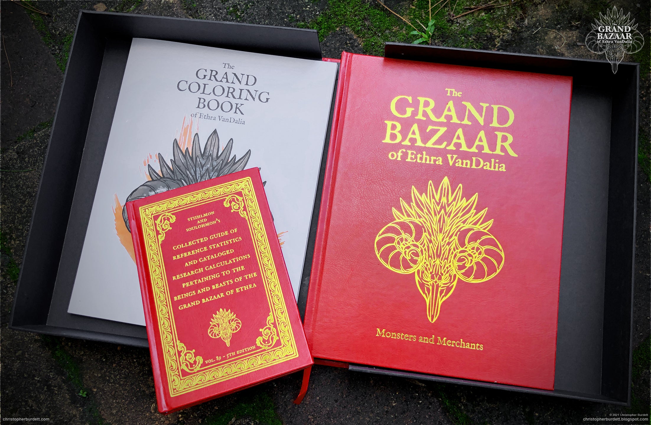 • The Grand Bazaar hardcover is the first book set in a world I first envisioned in 1998. The Grand Bazaar of Ethra VanDalia is an illustrated novel collecting different stories and points of view that introduce you to a world of monsters. The book features a red faux leather cover with embossed gold printing, 245 pages of art and stories, nearly 100 pieces of art, a fold-out map, and more! Take your first step into the Grand Bazaar with this book.