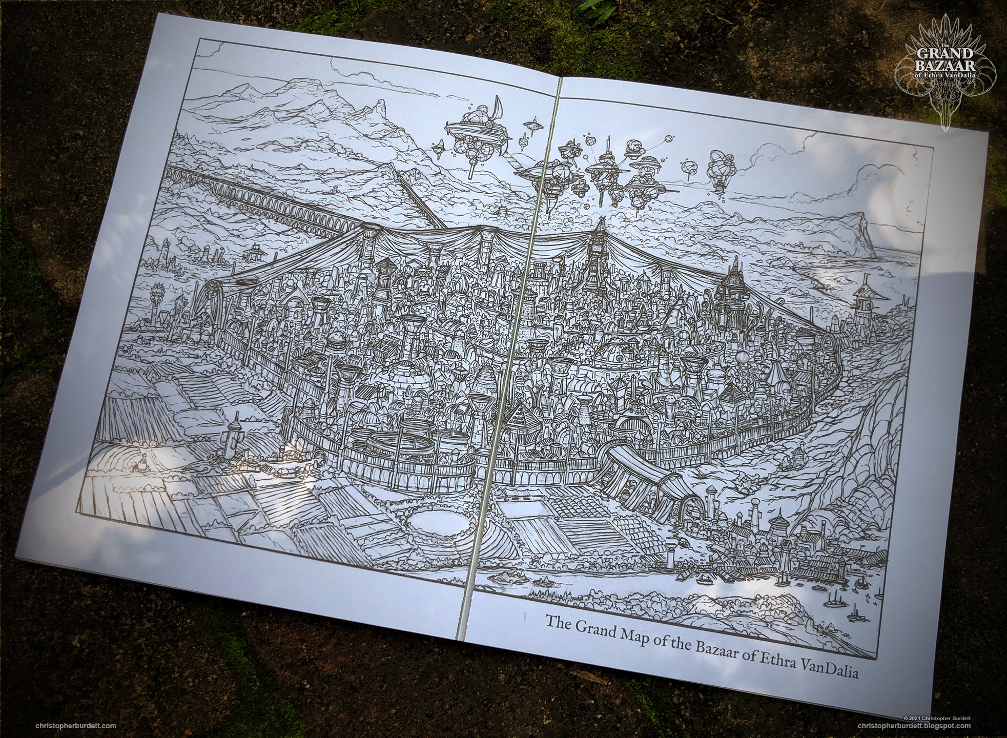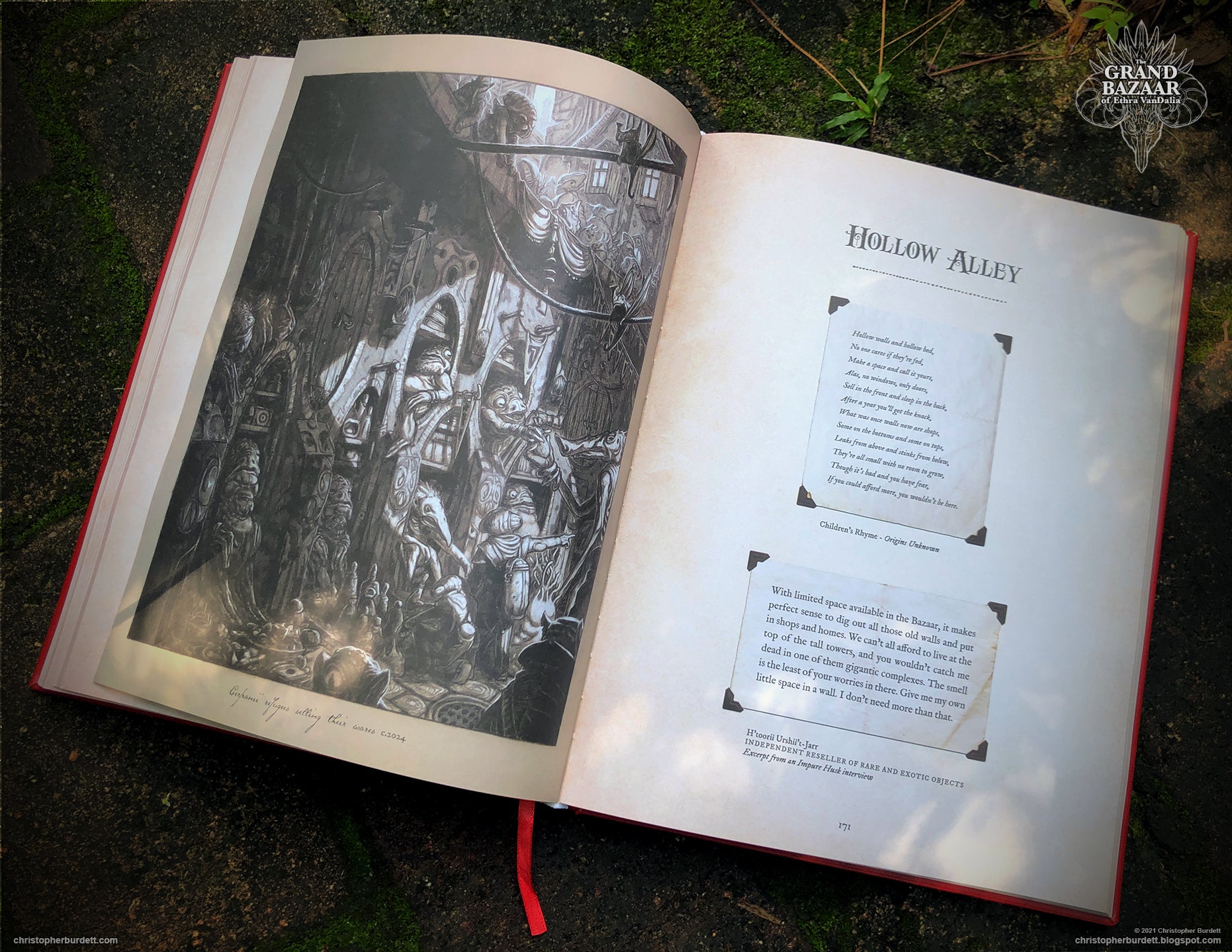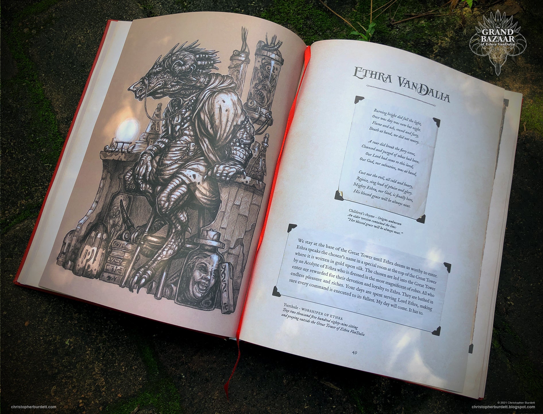 • The Grand Bazaar hardcover is the first book set in a world I first envisioned in 1998. The Grand Bazaar of Ethra VanDalia is an illustrated novel collecting different stories and points of view that introduce you to a world of monsters. The book features a red faux leather cover with embossed gold printing, 245 pages of art and stories, nearly 100 pieces of art, a fold-out map, and more! Take your first step into the Grand Bazaar with this book.