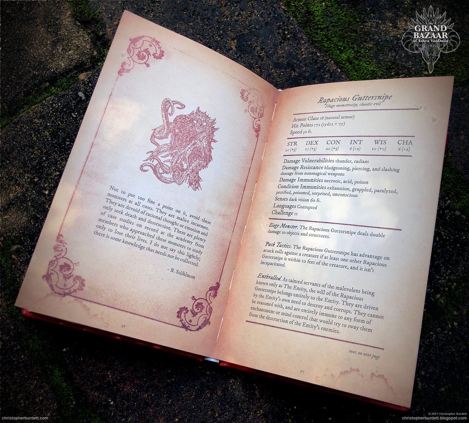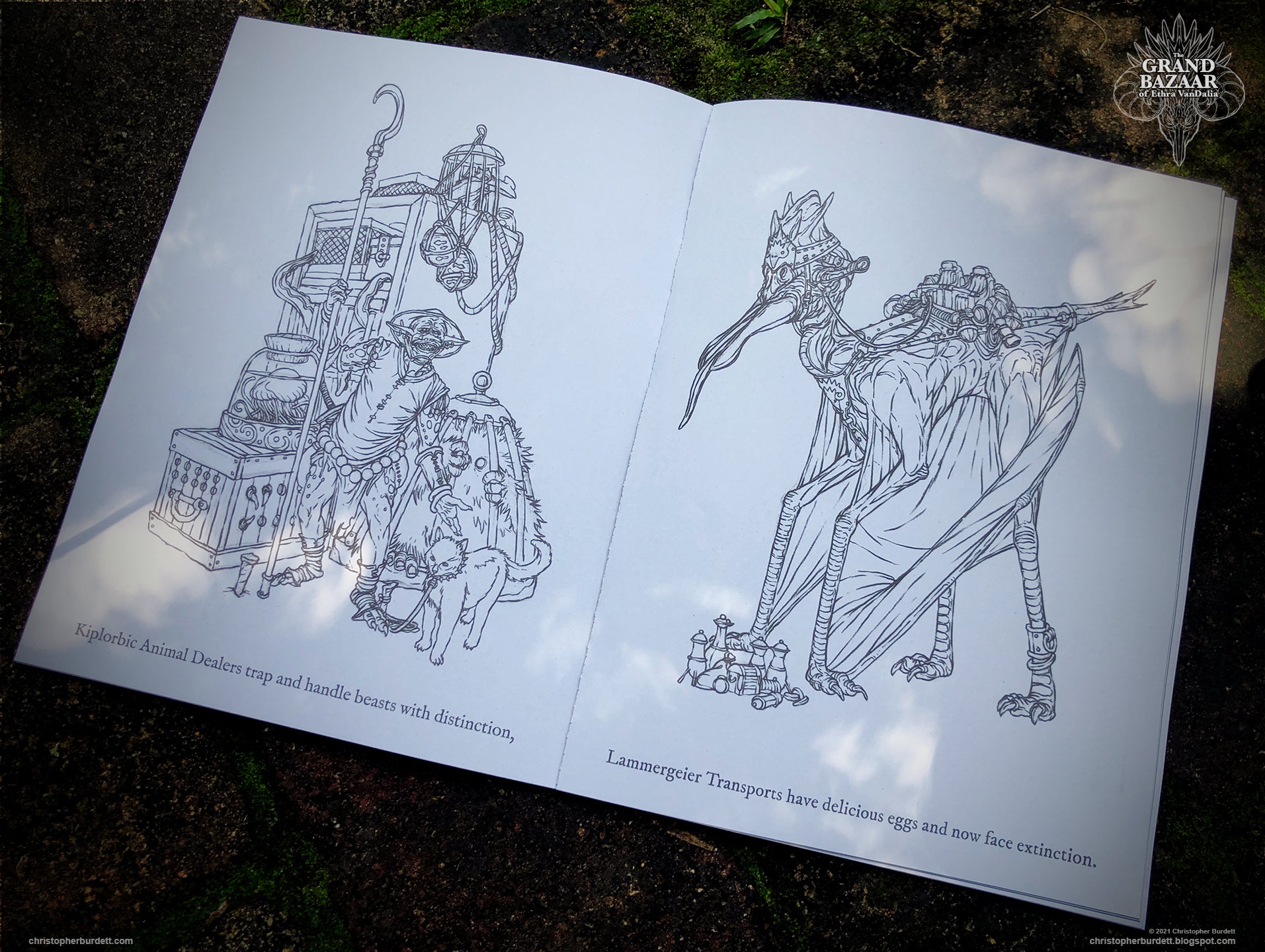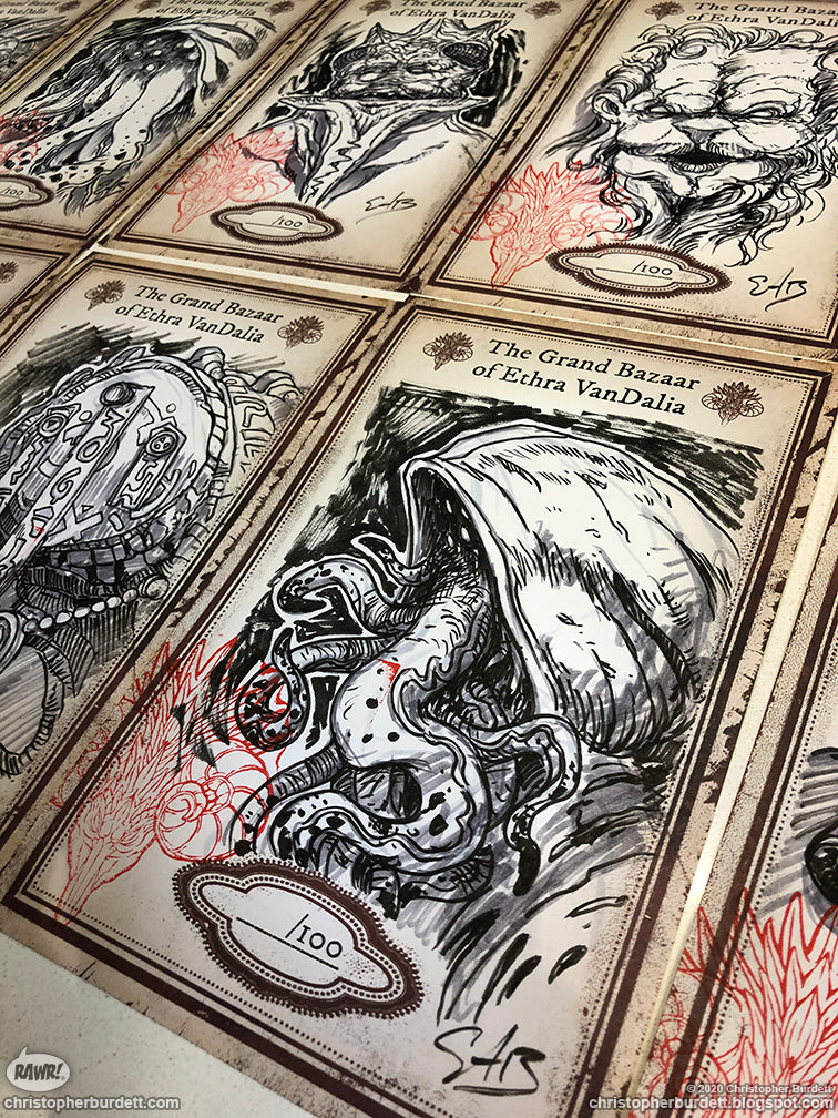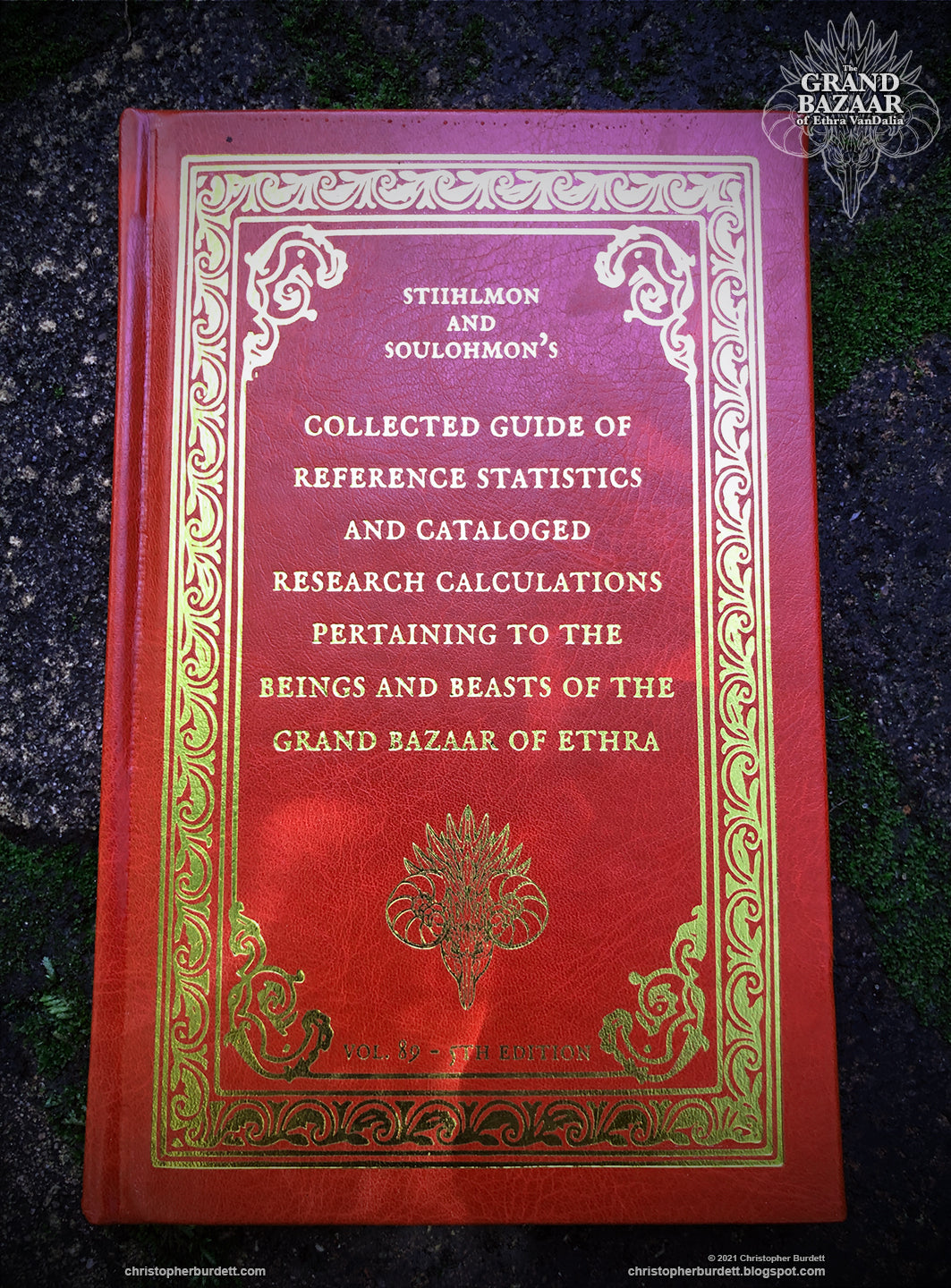 • The Grand Bazaar hardcover is the first book set in a world I first envisioned in 1998. The Grand Bazaar of Ethra VanDalia is an illustrated novel collecting different stories and points of view that introduce you to a world of monsters. The book features a red faux leather cover with embossed gold printing, 245 pages of art and stories, nearly 100 pieces of art, a fold-out map, and more! Take your first step into the Grand Bazaar with this book.